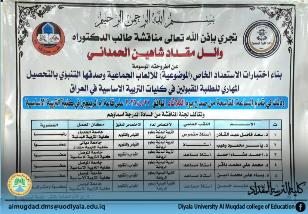 شارك الاستاذ الدكتور ياسر محمود وهيب التدريسي في كلية التربية المقداد عضوا في لجنة مناقشة اطروحة الدكتوراه الموسومة بـ (بناء اختبارات الاستعداد الخاص (الموضوعية) للالعاب الجماعية وصدقها التنبؤي بالتحصيل المهاري للطلبة المقبولين في كليات التربية الاساسية في العراق) التي اقيمت في كلية التربية الاساسية / جامعة الموصل.