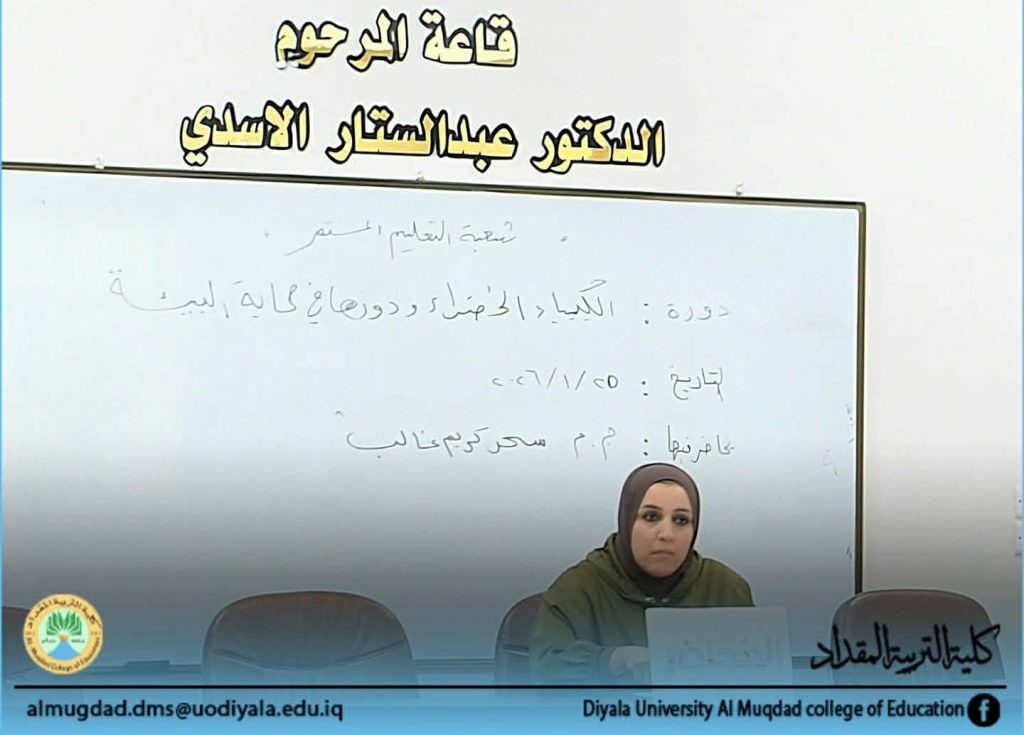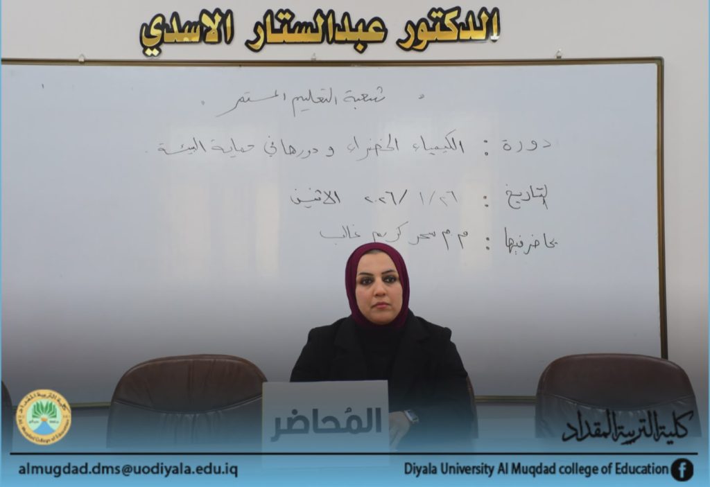 برعاية وإشراف السيد عميد كلية التربية المقداد الأستاذ الدكتور إياد هاشم محمد المحترم ، اقامت شعبة التعليم المستمر في الكلية دورة علمية بعنوان (الكيمياء الخضراء و دورها في حماية البيئة) ألقاها المدرس المساعد سحر كريم غالب يومي الأحد والإثنين الموافق 25 – 26 كانون الثاني 2026 وعلى قاعة المرحوم الدكتور عبد الستار الأسدي.