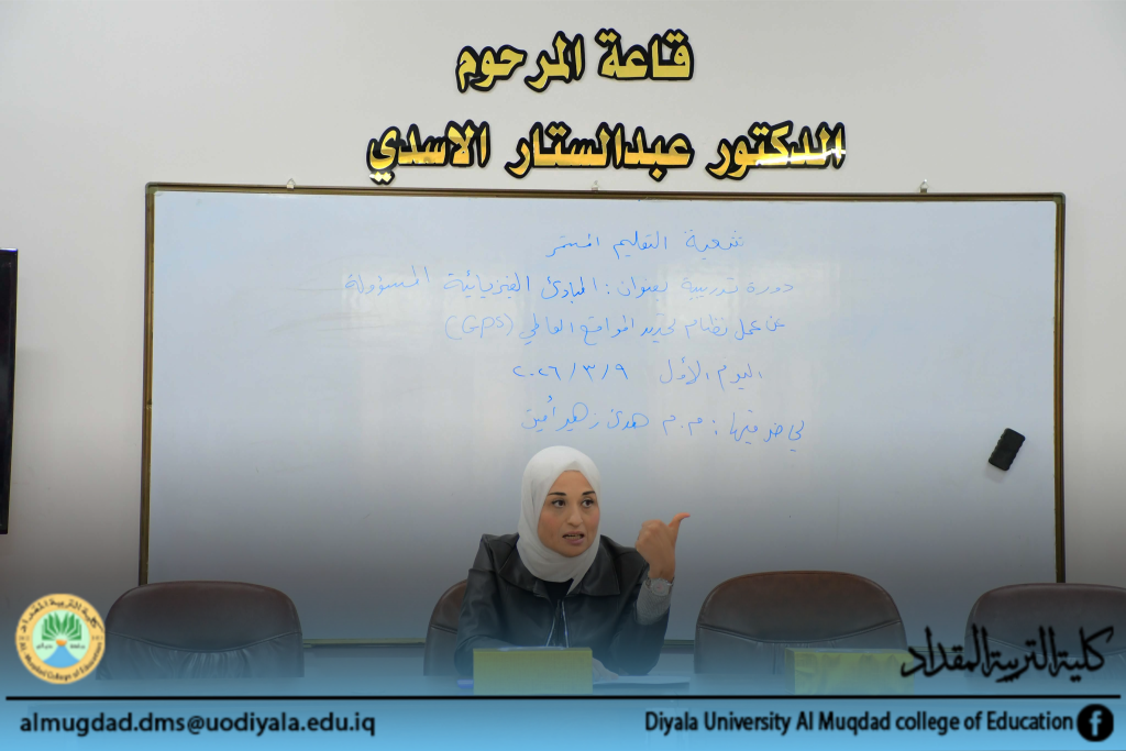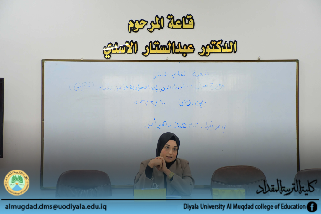 برعاية وإشراف السيد عميد كلية التربية المقداد الأستاذ الدكتور أياد هاشم محمد ،اقامت شعبة التعليم المستمر في الكلية دورة بعنوان (المبادئ الفيزيائية المسؤولة عن عمل نظام تحديد المواقع العالمي (GPS)) ولمدة يومين الاثنين و الثلاثاء المصادف 9-10 اذار 2026 حاضر فيها م.م. هدى زهير امين وعلى قاعة المرحوم الدكتور عبد الستار الأسدي