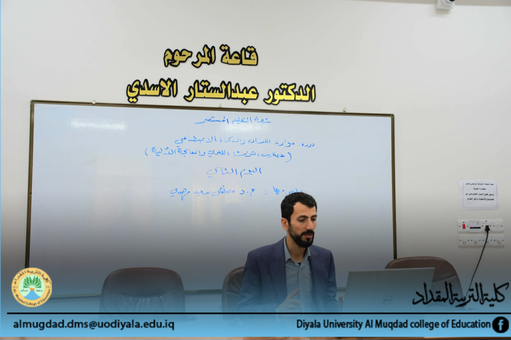 برعاية وإشراف السيد عميد كلية التربية المقداد الأستاذ الدكتور أياد هاشم محمد المحترم،اقامت شعبة التعليم المستمر في الكلية دورة بعنوان (موارد اللسان والذكاء الاصطناعي (مقابلة بين التراث اللغوي والمعالجة الألية)) ولمدة يومين.حاضر فيها م.د. مصطفى سعيد مهدي وعلى قاعة المرحوم الدكتور عبد الستار الأسدي