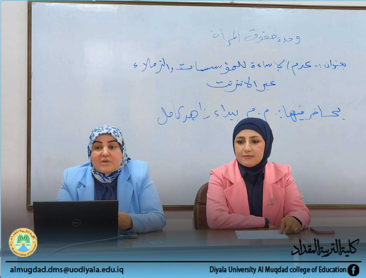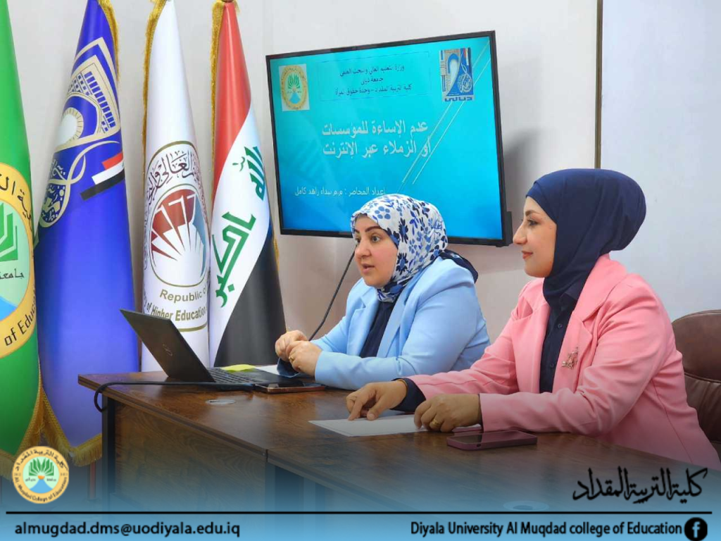 برعاية وإشراف السيد عميد كلية التربية المقداد الأستاذ الدكتور أياد هاشم محمد المحترم، نفذت وحدة حقوق الانسان في الكلية ، ندوة بعنوان ( عدم الإساءة للمؤسسات والزملاء عبر الانترنت ) ألقاها م.م. بيداء زاهد كامل، وعلى قاعة المرحوم الدكتور عبد الستار الأسدي