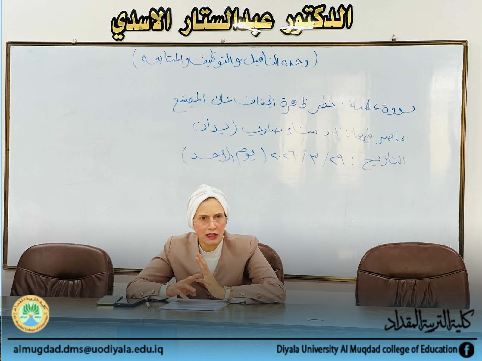 برعاية واشراف السيد عميد كلية التربية المقداد الاستاذ الدكتور أياد هاشم محمد المحترم ، أقامت وحدة التأهيل والتوظيف والمتابعة في الكلية ندوة بعنوان ( خطر ظاهرة الجفاف على المجتمع) ، اليوم الاحد الموافق 29 آذار 2026 ، حاضر فيها : م.د سناء ضاري زيدان، وعلى قاعة المرحوم الدكتور عبد الستار الأسدي .