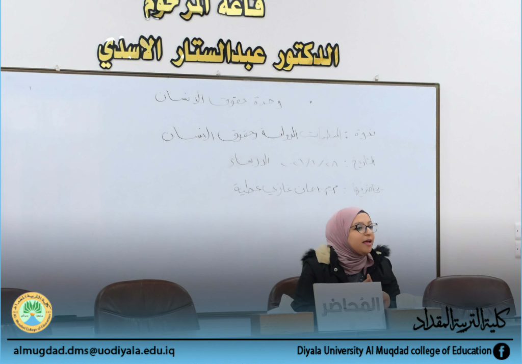 برعاية وإشراف السيد عميد كلية التربية المقداد الأستاذ الدكتور أياد هاشم محمد ، نظمت وحدة حقوق الانسان في الكلية ، ندوة توعوية بعنوان (المنظمات الدولية وحقوق الانسان ) ألقاها م.م ايمان غازي عطية اليوم الثلاثاء الموافق 27 كانون الثاني 2026 وعلى قاعة المرحوم الدكتور عبد الستار الأسدي.