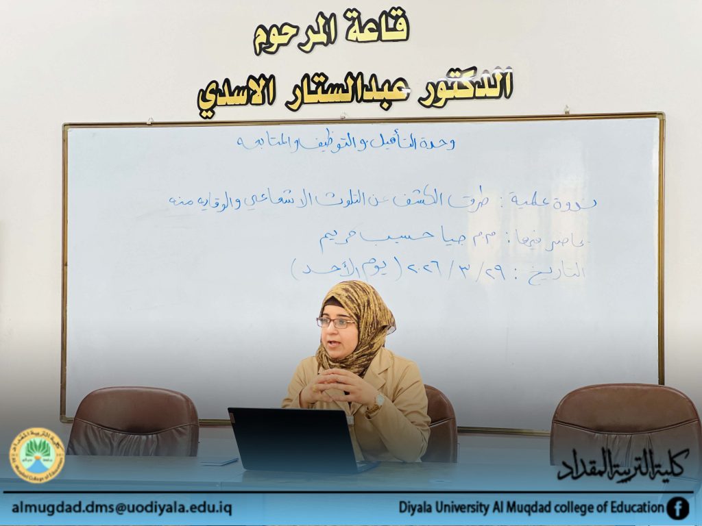 برعاية واشراف السيد عميد كلية التربية المقداد الاستاذ الدكتور أياد هاشم محمد المحترم ، أقامت وحدة التأهيل والتوظيف والمتابعة في الكلية ندوة علمية بعنوان ( طرق الكشف عن التلوث الاشعاعي والوقاية منه) ، اليوم الاحد الموافق 29 آذار 2026 ، حاضر فيها : المدرس المساعد جيا حسيب كريم، وعلى قاعة المرحوم الدكتور عبد الستار الأسدي .