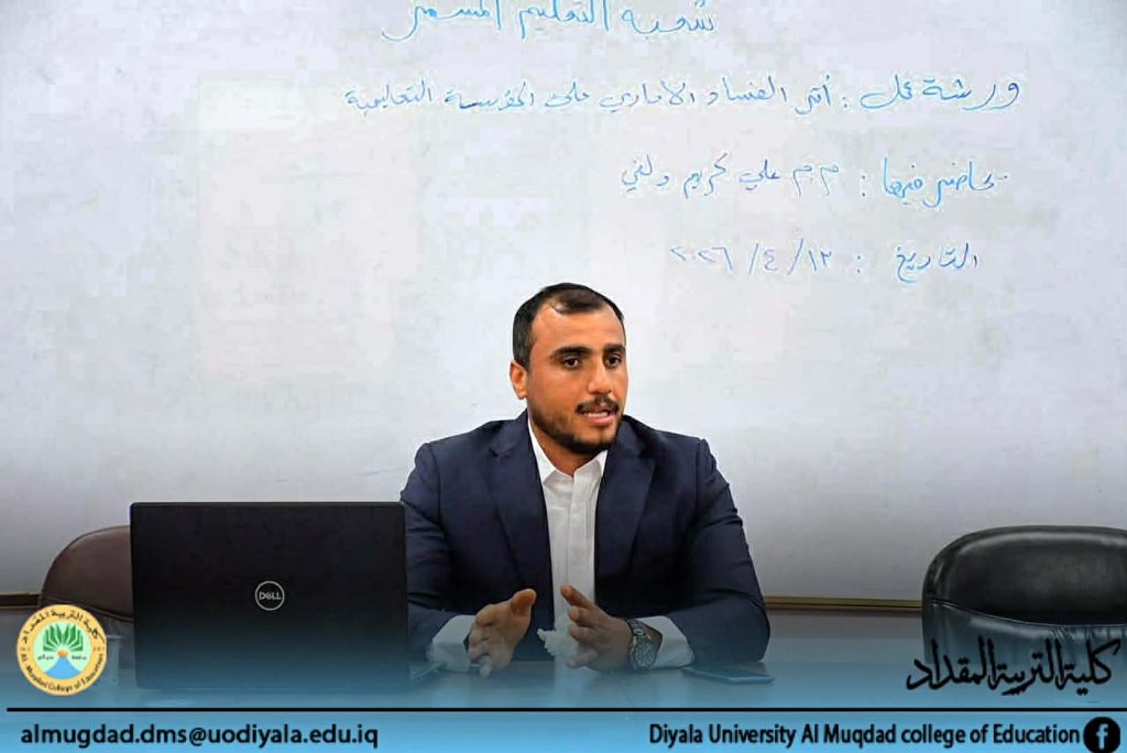 برعاية واشراف السيد عميد كلية التربية المقداد الاستاذ الدكتور أياد هاشم محمد المحترم ، أقامت شعبة التعليم المستمر بالتعاون مع الشعبة القانونية في الكلية ورشة عمل بعنوان ( أثر الفساد الاداري على المؤسسة التعليمية ) ، اليوم الاثنين الموافق 13 نيسان 2026 ،حاضر فيها : م.م علي كريم دلفي ، وعلى قاعة المرحوم الدكتور عبد الستار الأسدي .