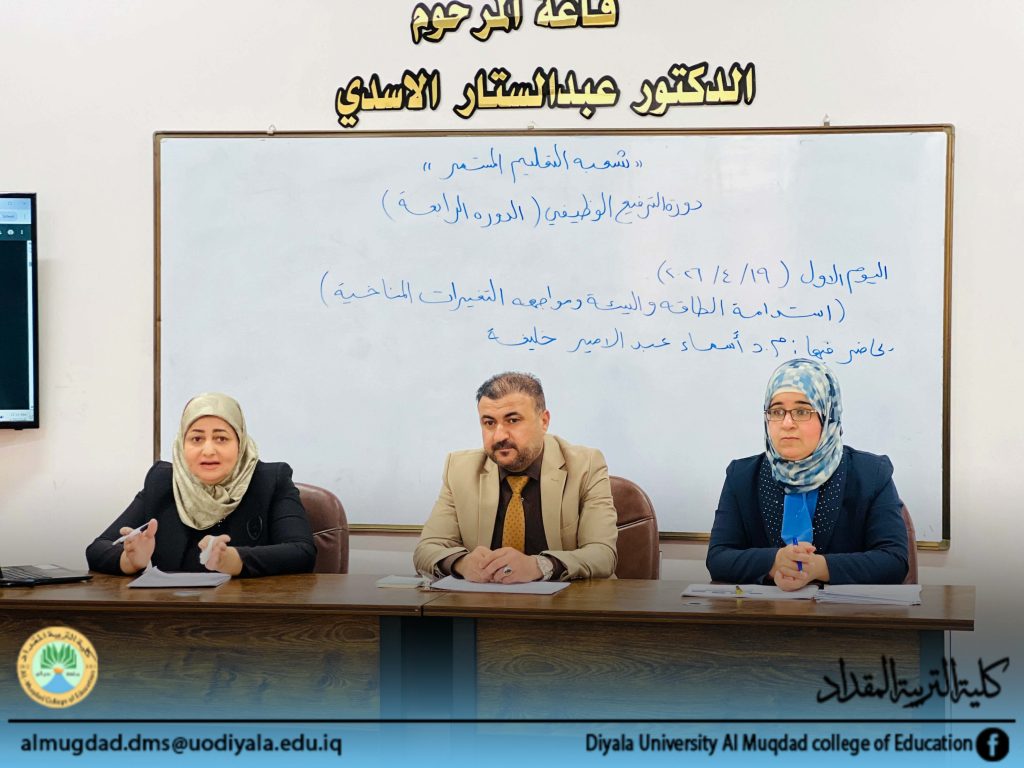 برعاية واشراف السيد عميد كلية التربية المقداد الاستاذ الدكتور أياد هاشم محمد المحترم ، أقامت شعبة التعليم المستمر دورة الترفيع الوظيفي الرابعة لمستحقي الترفيع من موظفي الكلية بعنوان ( استدامة الطاقة والبيئة ومواجهة التغيرات المناخية ) ،حاضر فيها : المدرس الدكتور اسماء عبد الامير خليفة ، اليوم الاحد الموافق 19 نيسان 2026 ، وعلى قاعة المرحوم الدكتور عبد الستار الاسدي .
