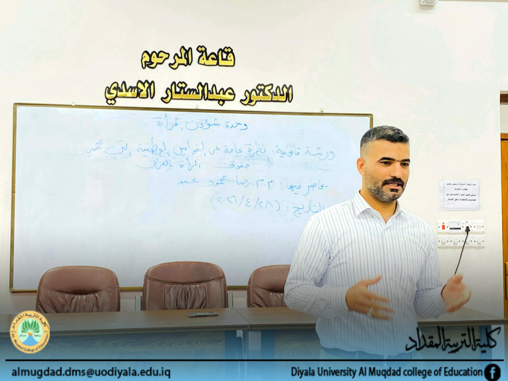 برعاية وإشراف السيد عميد كلية التربية المقداد الأستاذ الدكتور أياد هاشم محمد المحترم ، أقامت وحدة شؤون المرأة في الكلية ، ورشة قانونية بعنوان ( نظرة عامة عن القوانين الوطنية التي تحمي حقوق المرأة بالعراق ) حاضر فيها : م.م. رضا محمود عبد، يوم الثلاثاء الموافق 28 نيسان 2026 وعلى قاعة المرحوم الدكتور عبد الستار الأسدي .