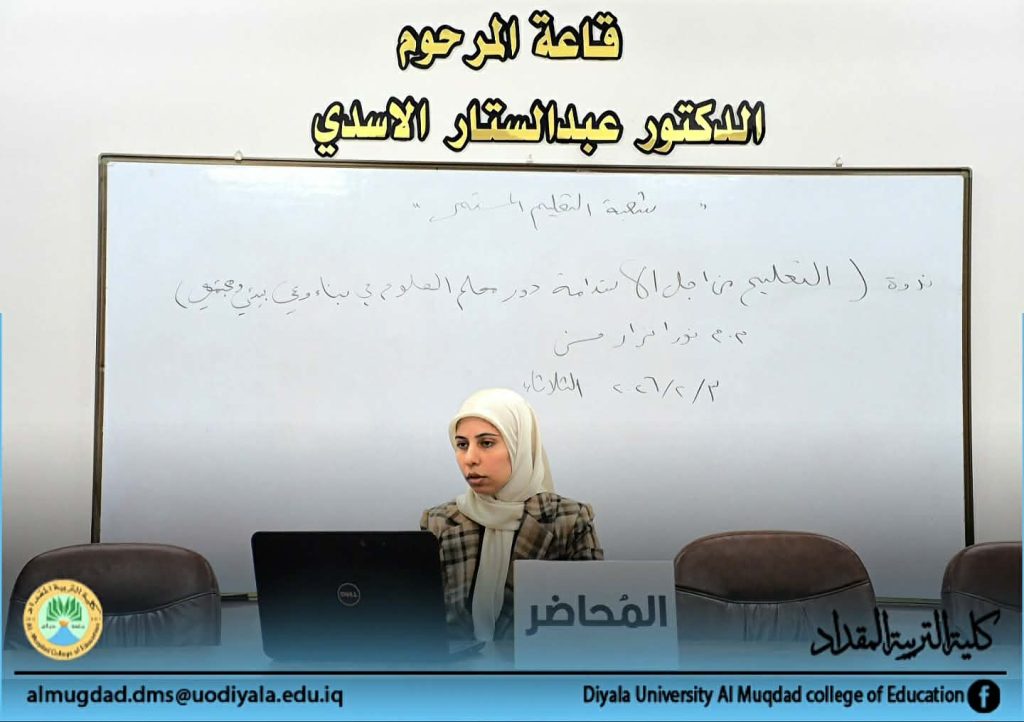 برعاية وإشراف السيد عميد كلية التربية المقداد الأستاذ الدكتور أياد هاشم محمد ، نظمت شعبة التعليم المستمر في الكلية ، ندوة بعنوان ( التعليم من أجل الاستدامة و دور معلم العلوم في بناء وعي بيئي ومجتمعي ) ألقاها المدرس المساعد نورا نزار حسن ، اليوم الثلاثاء الموافق 3 شباط 2026 وعلى قاعة المرحوم الدكتور عبد الستار الأسدي .